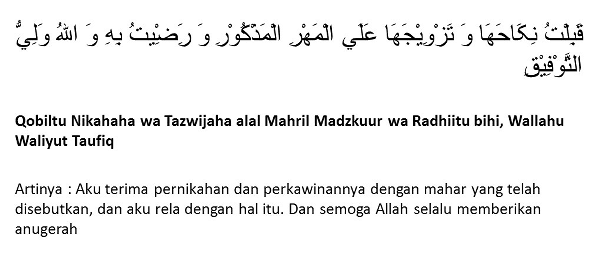 SAYA TERIMA NIKAHNYA DAN KAWINNYA (nama pengantin perempuan) BINTI (nama ayah dari pengantin perempuan) DENGAN MASKAWINNYA YANG TERSEBUT DIBAYAR TUNAI.