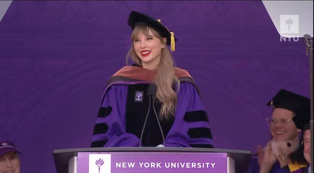 Dengan memakai jubah warna ungu dan toga di kepalanya dalam berpidato, Swift terlihat antusias serta memberikan kata-kata motivasi. Hadirin wisuda pun bersorak menyambut pidato yang disampaikan Taylor Swift.