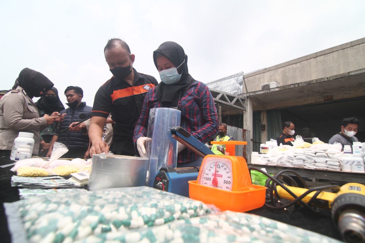 Kemudian tim melakukan pengembangan ke wilayah Kabupaten Bogor pada hari yang sama, sekira jam 21.00 WIB tim tiba di ruko LMC No. 122 Cibinong, Kabupaten Bogor, Jawa Barat, yang mana di ruko tersebut dijadikan tempat pembuatan atau produksi berbagai macam obat-obatan keras ilegal dan mengamankan WD, YN, dan AR, yang berperan sebagai pencetak obat, teknisi mesin, dan pemilik tempat produksi.